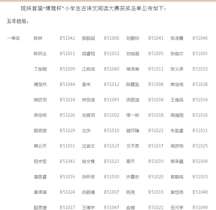 2016年上海第一届博雅杯语文竞赛成绩可以查询了,下面是五年级博雅杯获奖名单,详情如下。