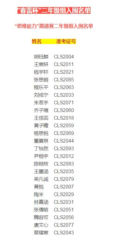 2017上海春蕾杯二年级思维能力决赛入围名单