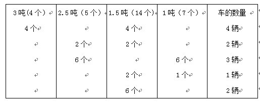 10. 今有重量为3吨的集装箱4个,重量为2.5吨的集装箱5个,重量为1.5吨的集装箱14个,重量为1吨的集装箱7个.那么最少需要用多少辆载重量为4.5吨的汽车可以一次全部运走集装箱?
