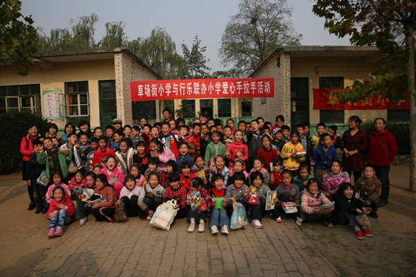 10月29日清晨,伴着微曦的晨光,草场街小学四四中队的师生来到赞皇县张楞乡行乐小学,和那里的师生开展“手拉手”活动,活动中孩子们将自己的图书、小礼物和行乐小学的孩子们互相交换,将一份温暖送入行乐小学的孩子们手中。手捧着一本本精美的图书,崭新的书包,漂亮的文具,行乐的孩子们将一包包满含真情的花生,送到了草场街孩子的手中。他们在亲切的交谈着,玩耍着,互相留下的联系方式,。老师将学生们用积攒的零花钱买来的足球、毽子、跳绳、跳棋等百余件文体用品交到了孙校长手中,丰富孩子们课余生活。中午大家一起吃农家饭,一起在地里刨捡红薯,孩子们拿着自己的劳动果实,无比的开心。