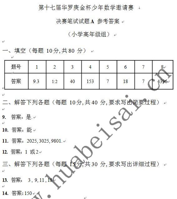 第十七届华杯赛小学高年级组决赛笔试试卷A答案