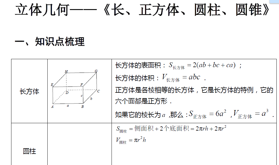 点击下载完整版试题>>>长、正方体、圆柱、圆锥(一)知识点梳理及例题