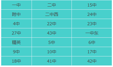 根据14年的招生简章中的分配生计划表,涉及到的高中有:1中、15中、附中、2中、二中西校区、24中、4中、22中、23中、27中、43中、一中东校区、精英、5中、6中、9中、10中、17中、18中、41中、42中。