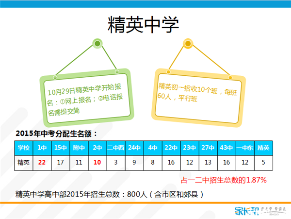 2、精英初一招收10个班,每班60人,平行分班,没有终点班。这600人中还有200人是精英小学的学生直升的。提醒:今年精英初中部和高中部分离,将搬到学府路的新校区,可能会扩招。