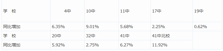 5.文化、艺术普高双丰收。我区文化类考生4877人,达到440分普高线3433人,普高率70.39%,同比增加3.81个百分点。多所学校文化类同比增加的百分点如下表: