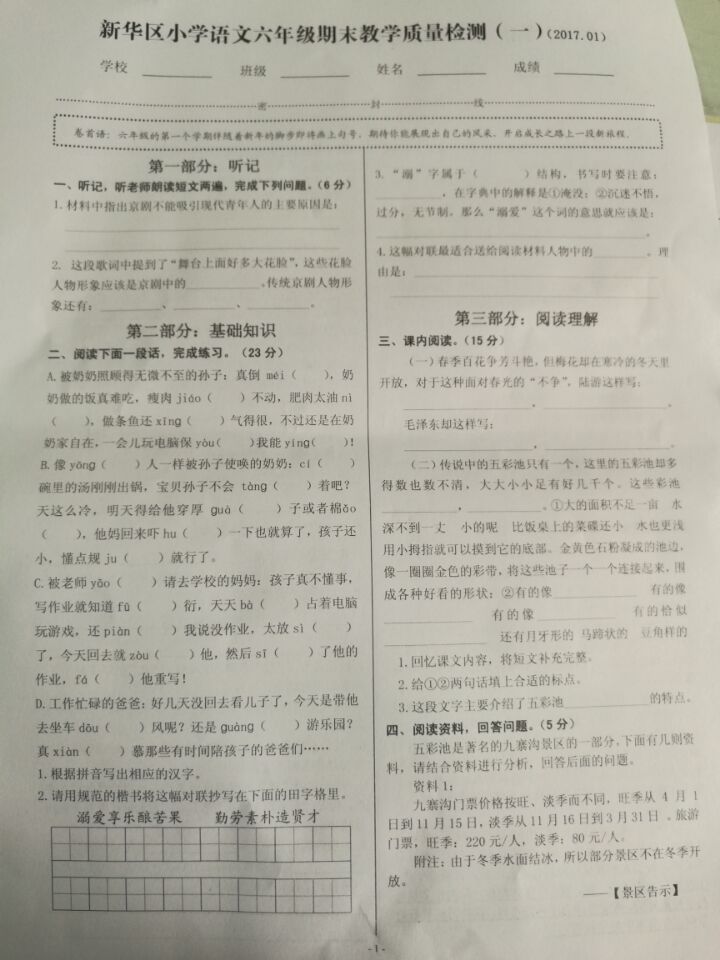 2016-2017学年石家庄新华区六年级期末测试题语文卷