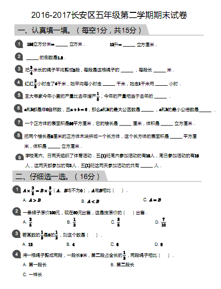 石家庄主城区2017年小学五年级数学期末试题:长安区 石家庄家长帮 2018-06-16 14:48:44 石家庄主城区2017年小学五年级数学期末试题:长安区 >>点击查看解析 首页 上一页 下一页 尾页