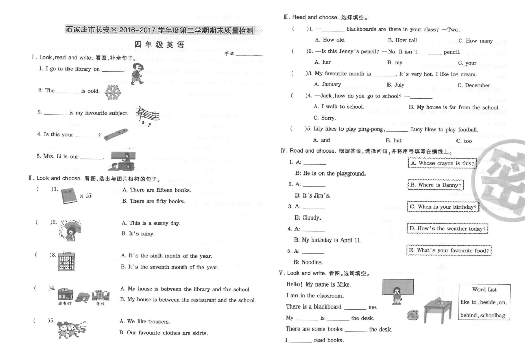 石家庄主城区2017年小学四年级英语期末试题:长安区