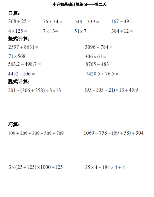 2018年石家庄小学基础计算练习:第二天