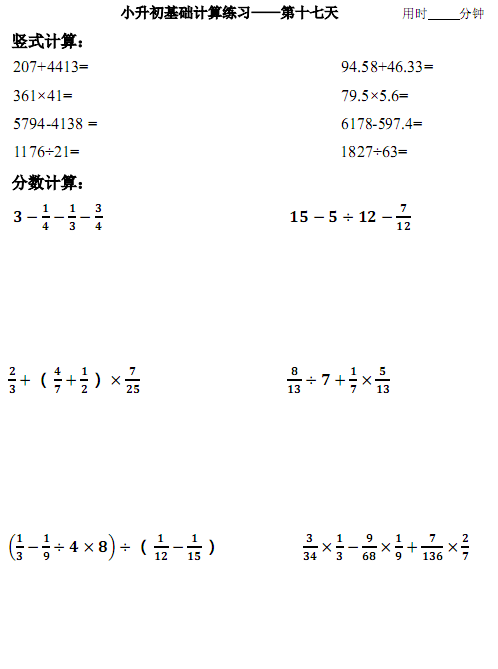 2018年石家庄小学基础计算练习:第十七天