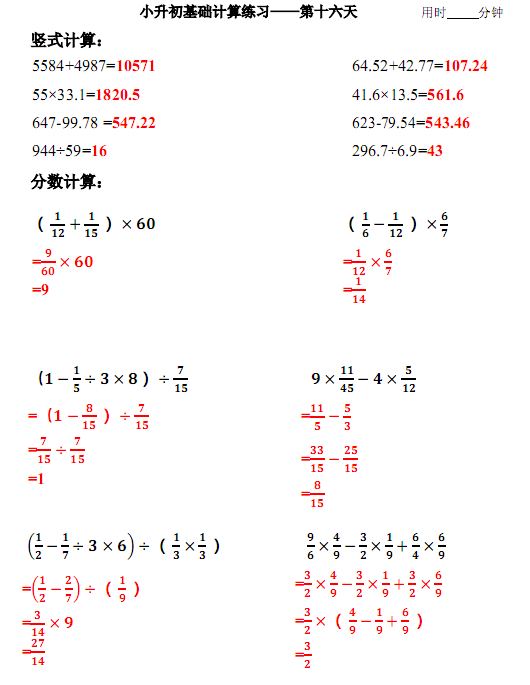 2018年石家庄小学基础计算练习解析:第十六天