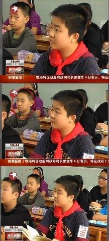 从画面上看,这应该是东方卫视的节目。成都晚报记者在网上找到了这段由东方卫视于3日播出的“争议黄艺博”的采访,而这三张图片正是截自节目结尾处的几秒钟。而网友们还发现,整个教室里仅黄艺博一人戴着红领巾和“五道杠”,且红领巾大得离谱,明显是“成人版”。而所有同学的椅子都是木靠背,黄艺博邻座的同学却似乎坐了一把办公椅。这些“亮点”再次引发网友对“五道杠”摆拍炒作的质疑。