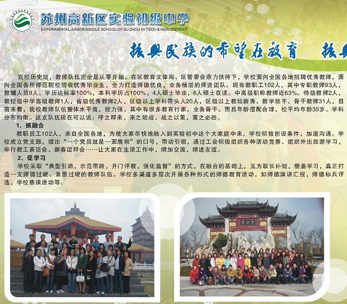 苏州新区实验中学的师资力量是非常好的,近年来,新区中学聘请很多南通等教育大市的名师,以壮大新区的师资力量。以下是奥数网编辑整理的关于新区实验中学的师资发展规划,供家长们了解新区实验中学的发展。