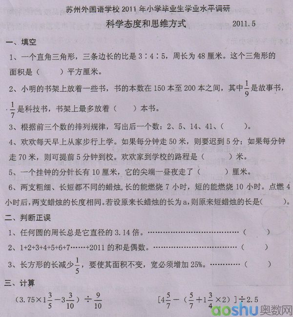 摘要:苏州外国语学校小升初入学考试是进入苏外的第一道门槛,苏州奥数网整理2011年苏州外国语学校小学生学业水平调研试题——数学。