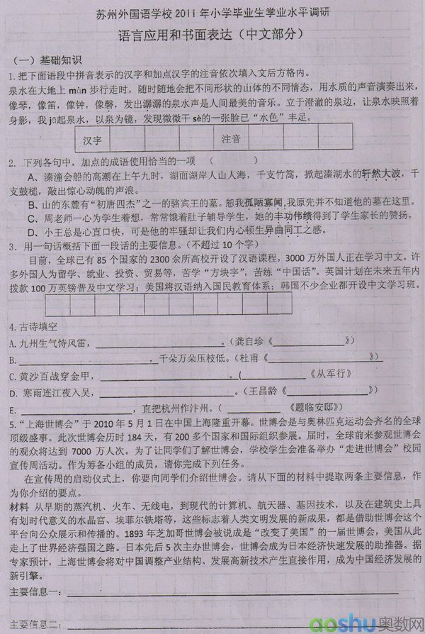 摘要:苏州外国语学校小升初入学考试是进入苏外的第一道门槛,苏州奥数网整理2011年苏州外国语学校小学生学业水平调研试题——语文。