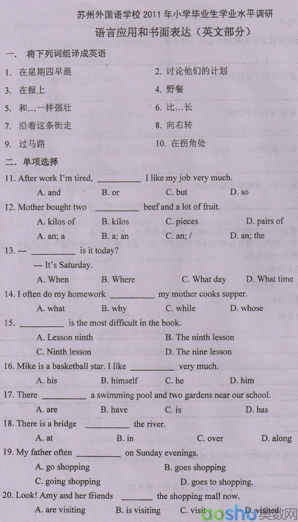 摘要:苏州外国语学校小升初入学考试是进入苏外的第一道门槛,苏州奥数网整理2011年苏州外国语学校小学生学业水平调研试题——英语。