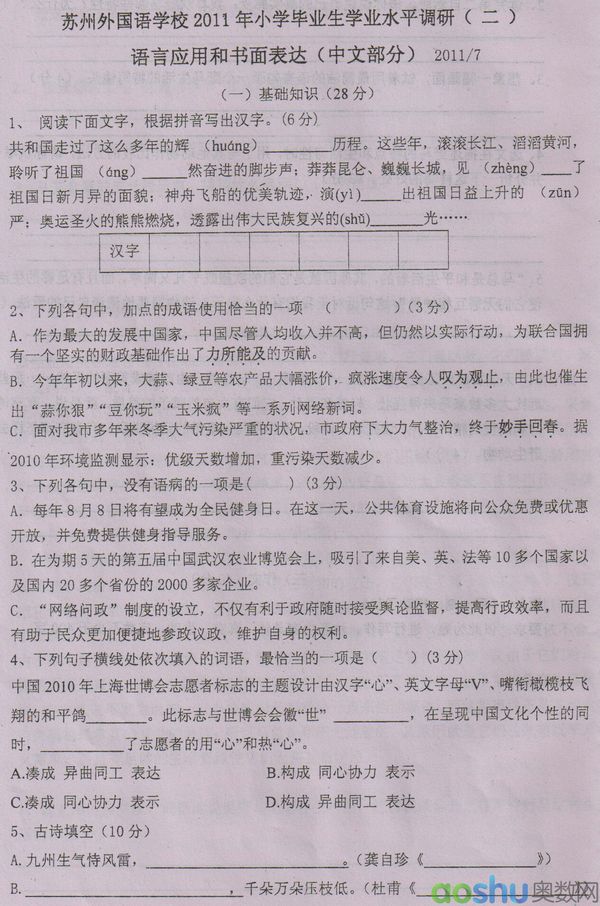 2011苏州外国语学校小学毕业生学业水平调研二——语文