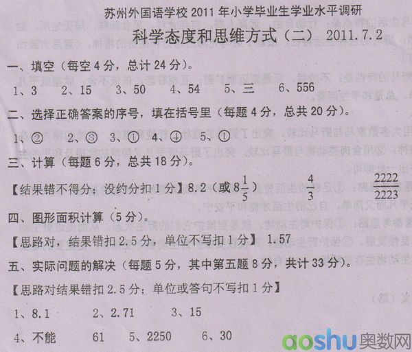2011苏州外国语学校小学毕业生学业水平调研二——数学答案