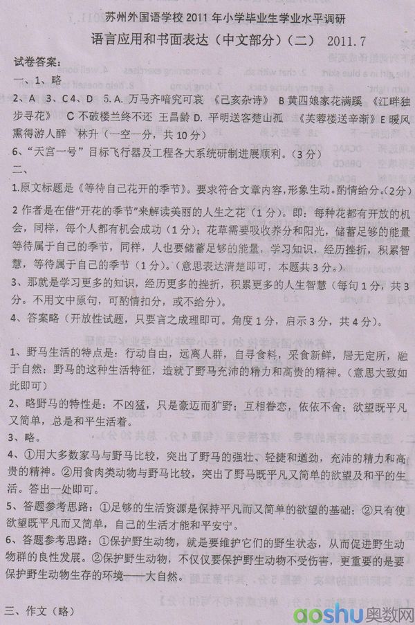 摘要:苏州外国语学校小升初入学考试是进入苏外的第一道门槛,苏州奥数网整理2011年苏州外国语学校小学生学业水平调研二试题——语文答案。