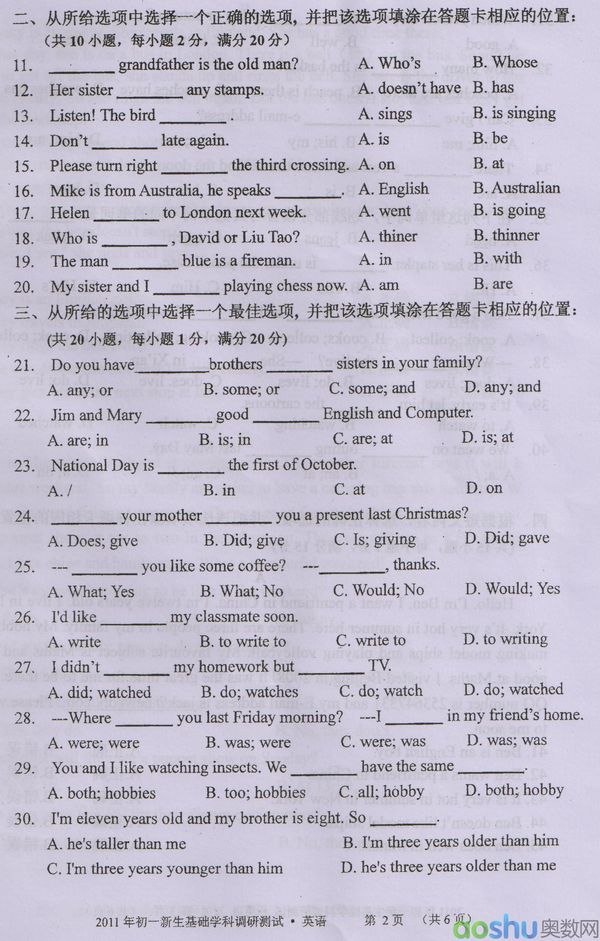 2011年苏州市初一新生基础学科调研测试英语(2)