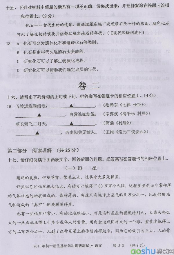 2011年苏州市初一新生基础学科调研测试语文(5)