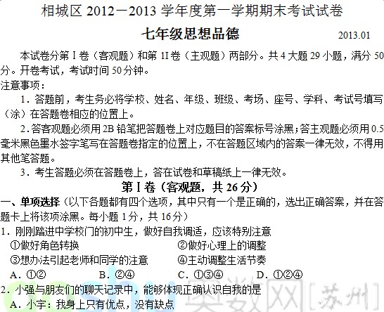 苏州相城区2012-2013第一学期期末考试试卷 初一思品