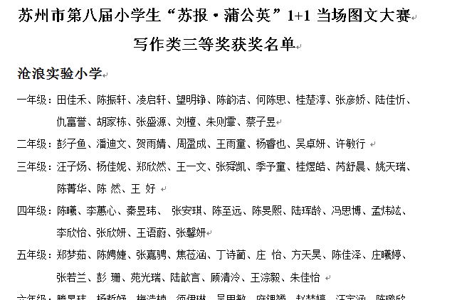 苏州奥数网讯:2014苏州第八届蒲公英图文大赛各奖项获奖名单已经出炉,小编为大家第一手送上获奖名单,下面是写作类三等奖获奖名单,小伙伴们快来看看获奖了没吧。