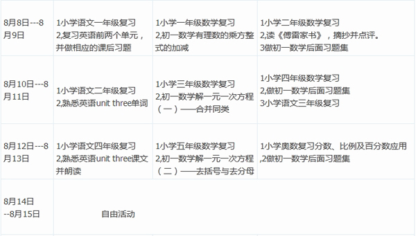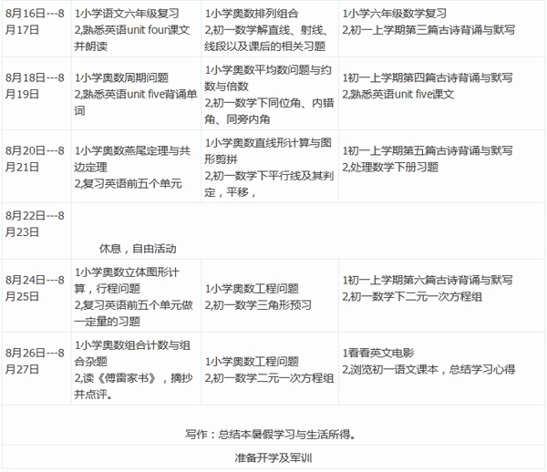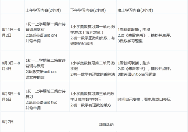 苏州奥数网 来自家长帮社区的家长@安徒生童话家长:小孩升初一了,漫漫的七月即将过去,在过去的一个月里也没怎么让孩子看书,打算在八月份让孩子好好恶补一下,现在和大家一起分享一下我们的暑假八月详细计划吧。