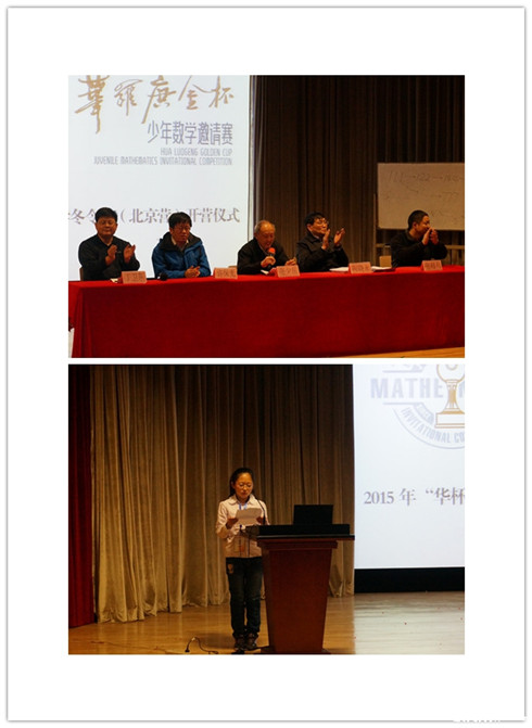 各位嘉宾老师们已经到位,分别是华杯赛组委会办公室常务副主任丁卫东、中科院科技政策与管理科学研究所研究员许保光、华杯赛组委会副秘书长张少岳、华 杯赛组委会委员、主试委员会委员陶晓永还有学而思高级总监张超月老师。首先是张少岳老师给大家致开营词。下图是北京人大附中的学生代表发言。