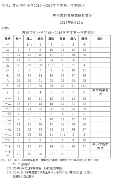 而且还发布了根据江苏省教育厅有关通知精神,结合苏州市实际的苏州市中小学2015~2016学年度第一学期校历。