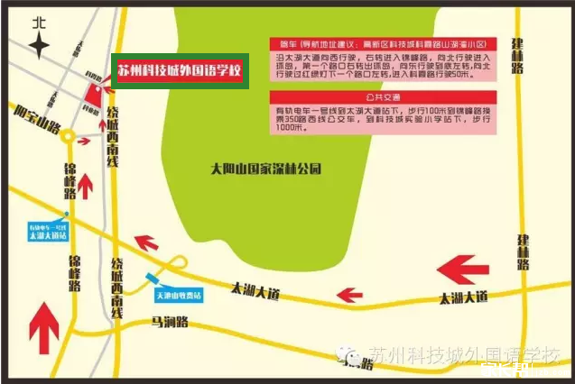 吴江、昆山、太仓、常熟、张家港方向:苏州绕城高速(西南线)——天池山出口(往科技城方向)——太湖大道——过青山大桥(右转)——锦峰路——环岛(右转,向东)——三岔口(左转,向北)——第二个三岔口左转(第一个三岔口有路牌指示)——抵达目的地。