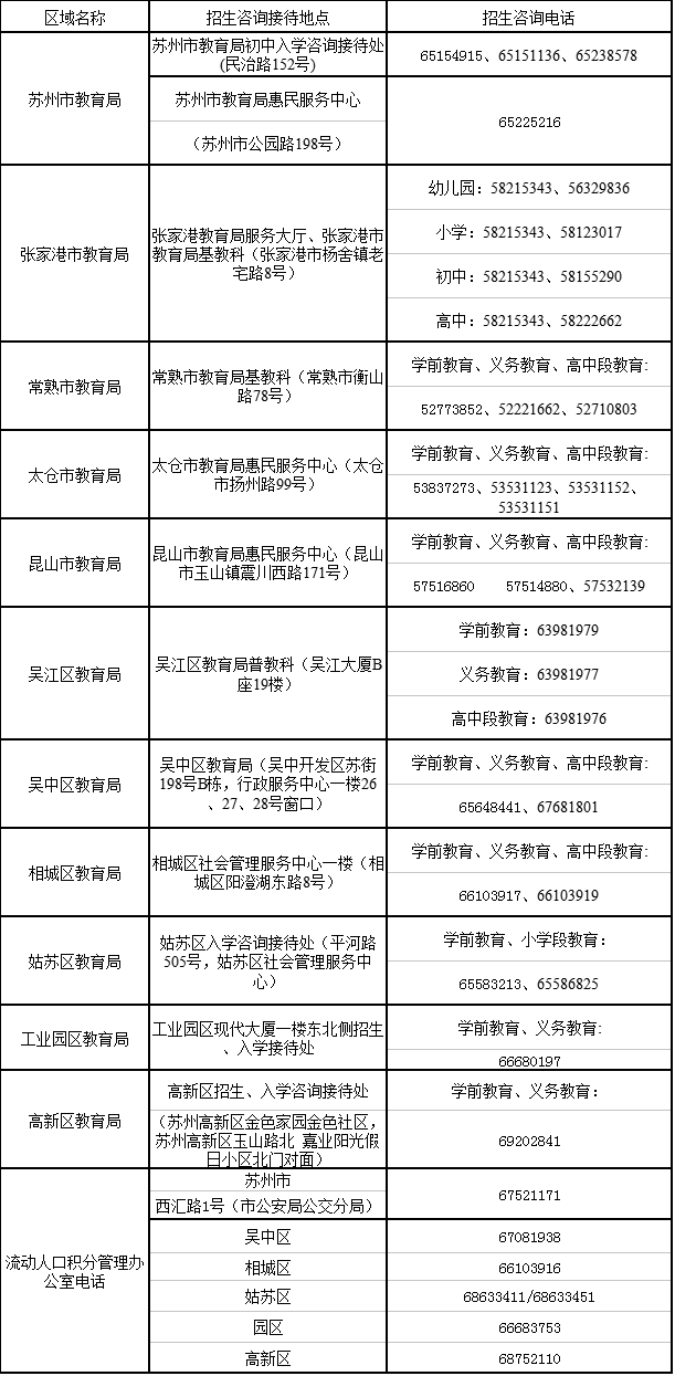 2017年苏州市各级各类中小学校幼儿园入学入园招生咨询工作安排一览表