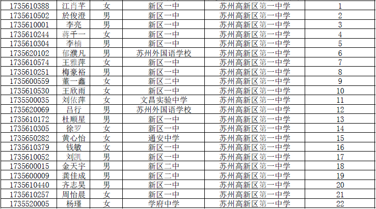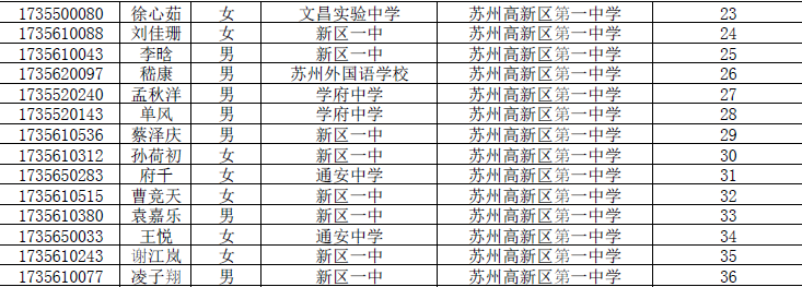 2017年苏州新区一中自主招生预录取名单