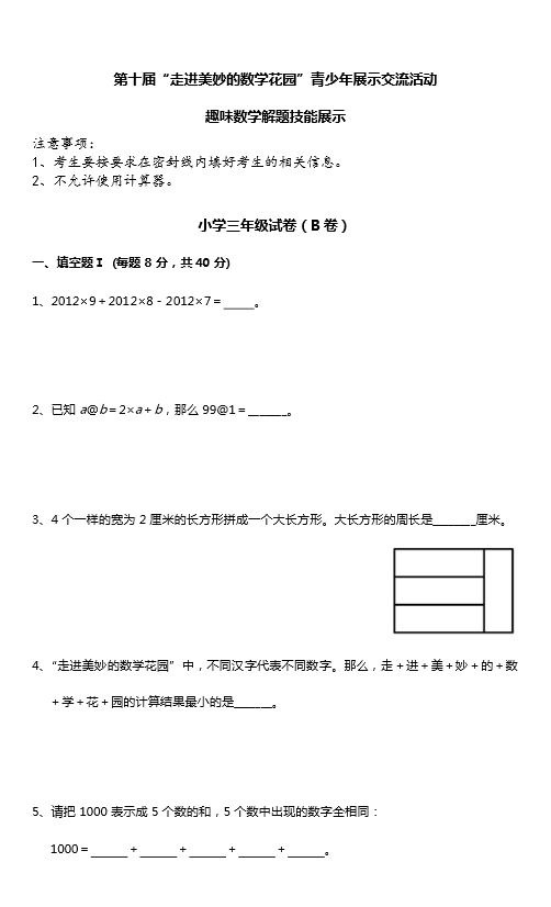 2015年沈阳第十三届“走进美妙的数学花园”(简称“走美杯”)即将在本周末(3月8日)上午开赛,三、四年级考试时间为8:30~10:00,五、六年级考试时间为10:30~12:00。2012年第十届三年级真题及答案如下: