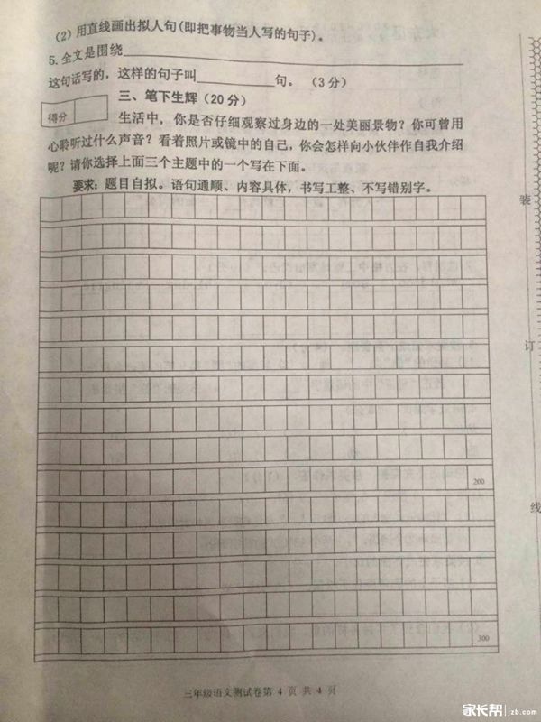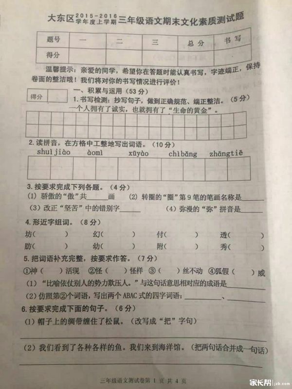 2016年沈阳大东区三年级语文上册期末试卷