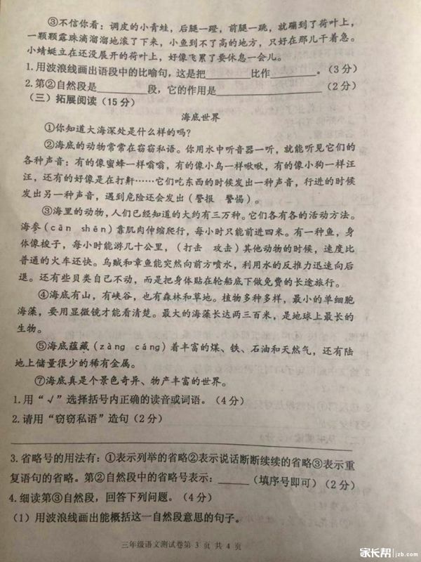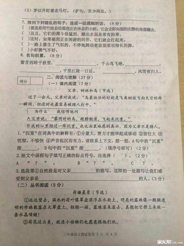 2015-2016学年沈阳大东区三年级语文上册期末考试试卷