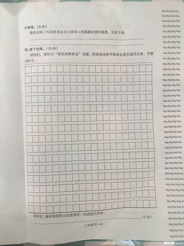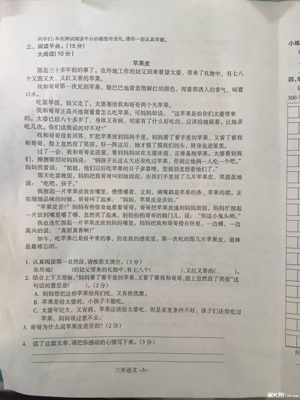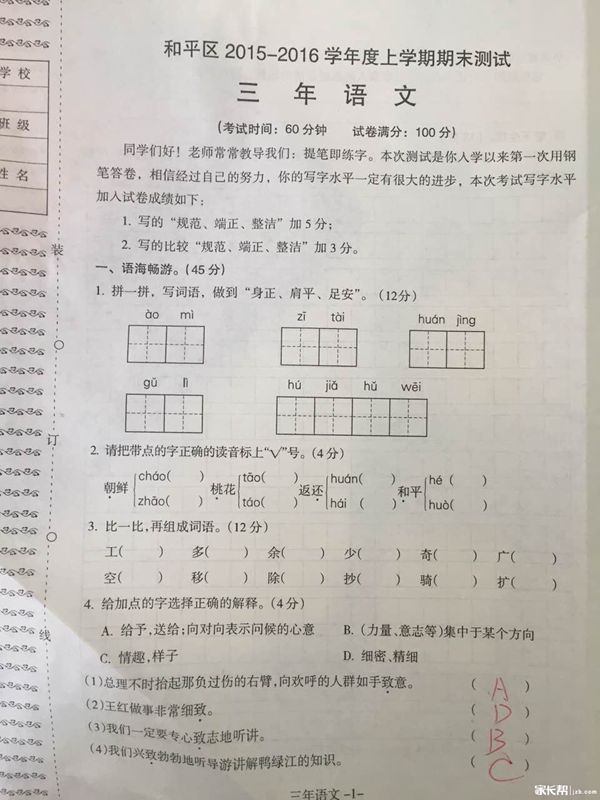 2015-2016学年沈阳和平区三年级语文上册期末考试试卷