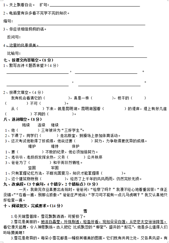 2019年沈阳小学四年级语文期末模拟试题(六)(2)
