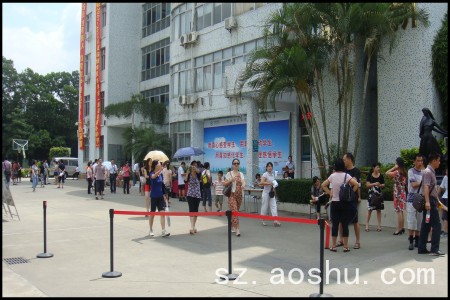 早上8:30深中的入学考试准时拉开了序幕,将近1千人在炎炎夏日里聚集在福景外的校园内。由于福景外临时将操场改做了停车场,所以那天道路还算畅通。小编赶到时,孩子们已经有序地进入了考场准备考试了。但据老师说,也有一些领了准考证的学生缺考,估计是去参加市外分校的考试了。考场周围用红色绳子拉起来,学生进去后就不能再出来。家长们则集中到阶梯教室和校园的各个地区休息等待。