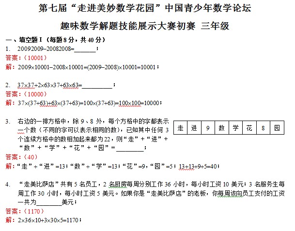 2009年第七届“走美杯”初赛三年级组真题及答案