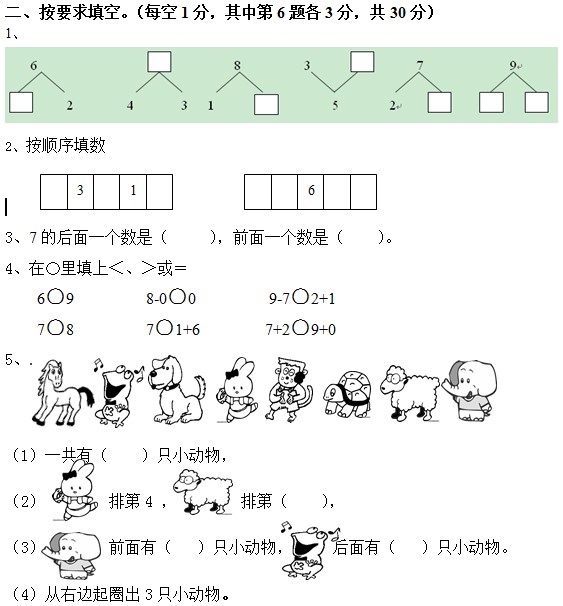 深圳奥数网10月24日 随着期中考的逼近,小编收集了一些试题给大家练练手,希望对大家有帮助。以下是小学数学一年级期中检测题