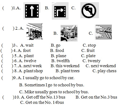 一、Listen and choose(听音,根据你所听到的内容,选择相符合的一项,并将其字母编号写在题前的括号里。)(10分)