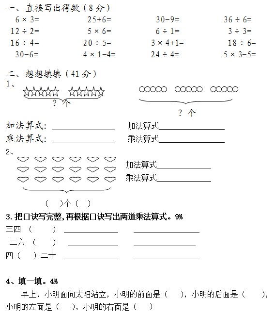 深圳二年级上册数学期中试卷(苏教国标版)