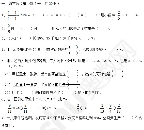 深圳小学六年级第一学期数学期末模拟试卷(苏教版)