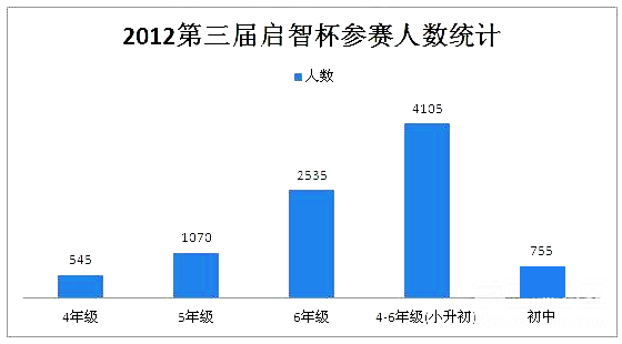 分析:从以上数据可以看出,2012年参加启智杯的学生共有4860人,4-6年级学生4105人而其中最多的是六年级的学生,可见面临小升初的学生占了85%。说明还是有很多家长和学生是非常重视启智杯。