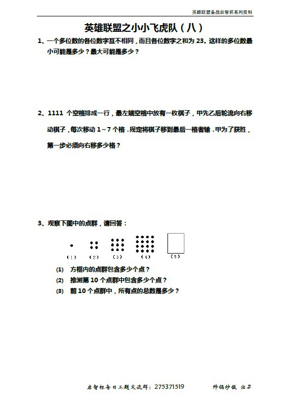 从10月16日开始,启智杯备战正式起航哦,炒饭老师采 用的是周二到周五每天三道启智杯练习题,第二天上传答案的模式。由于启智杯四、五、六 年级同一套题,因此特训题目同样不分年级不分界限,四五六年级的小朋友均可做。孩子们可回家后每天跟着做三道题,做完后可把自己的答案贴出来,做全对的可 得到20金币奖励哦!连续一周全对着的小盆友将有机会被邀请参加线下活动哦。