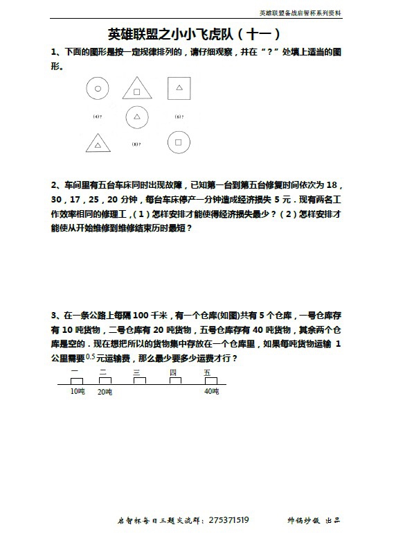 从10月16日开始,启智杯备战正式起航哦,炒饭老师采 用的是周二到周五每天三道启智杯练习题,第二天上传答案的模式。由于启智杯四、五、六 年级同一套题,因此特训题目同样不分年级不分界限,四五六年级的小朋友均可做。孩子们可回家后每天跟着做三道题,做完后可把自己的答案贴出来,做全对的可 得到20金币奖励哦!连续一周全对着的小盆友将有机会被邀请参加线下活动哦。