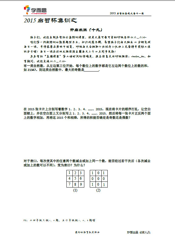 2015年深圳启智杯备考辅导试题及解析(十九) 深圳奥数网 2015-11-03 10:15:20 深圳奥数网:2015年深圳启智杯比赛将近,文章整理了备考辅导试题和解析,对2015启智杯备考很有帮助。 【试题目录>>>启智杯备考辅导试题及解析汇总】 【试题下载>>>启智杯备考辅导试题及解析】 试题: 答案请见第二页 首页 上一页 下一页 尾页