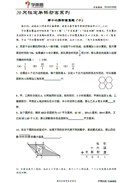 2016年深圳华杯赛初赛备考试题及解析(十) 深圳家长帮 2015-11-25 14:19:37 深圳奥数网:2015年深圳华杯赛初赛将近,文章整理了备考辅导试题和解析,对2016华杯赛备考很有帮助。 【试题目录>>>2016年深圳华杯赛初赛备考试题及解析汇总】 试题: 答案请见第二页 首页 上一页 下一页 尾页