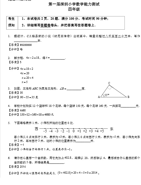 2014年深圳首届小数测四年级试题及答案解析